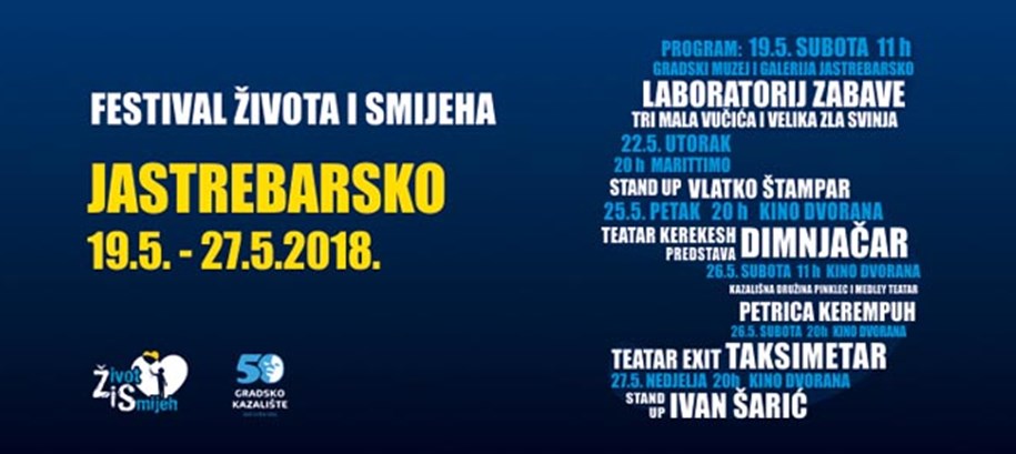 Petu godinu zaredom, Gradsko kazalište Jastrebarsko organizira festival „Život i smijeh“. Pred nama su dva vikenda ispunjena smijehom, a bogati program namijenjen je svim generacijama ljubitelja kazališne umjetnosti.
